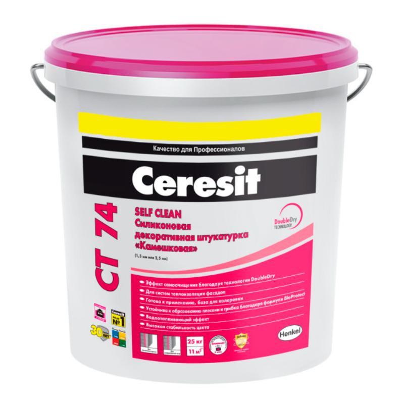 Штукатурку Ceresit CT 74 применяют для получения финишного слоя с "камешковой" фактурой как внутри, так и снаружи зданий. В том числе используют в системах наружной теплоизоляции декоративного штукатурного фасада с минеральной ватой или пенополистиролом в качестве утеплителя.