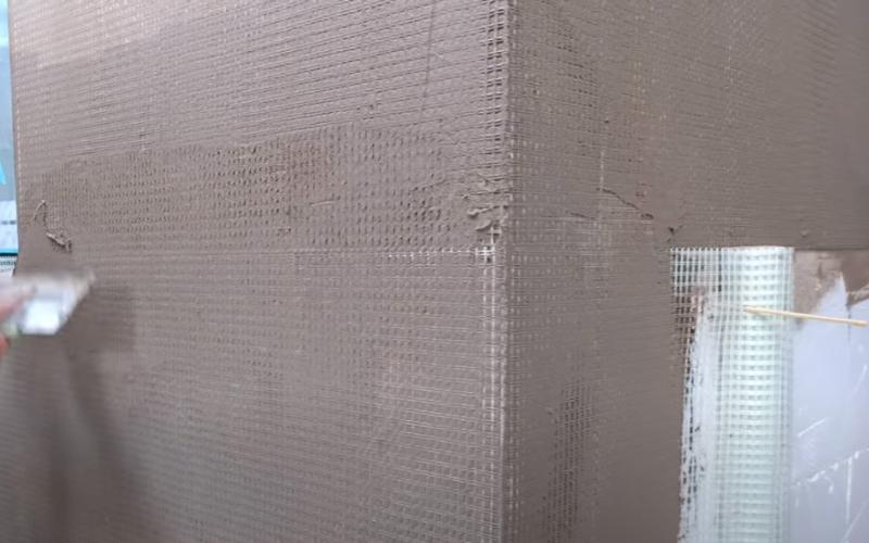 Фасадную стеклосетку накладывать сверху вниз при перехлесте листов сетки на 100 мм. Запрещается обрубать шпателем фасадную коррозиестойкую стеклосетку на углах и в местах примыкания. Не допускается прижатие вплотную стеклосетки к утеплителю. Во избежание образования мелких трещин и посторонних включений запрещается чрезмерное выравнивание базового штукатурного слоя после армирования.